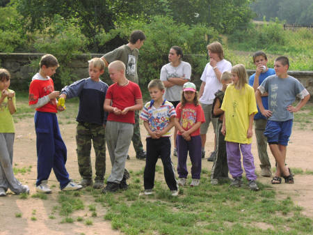 Dnešní den nebyl na události bohatý. Největší událostí bylo to, že se nám do tábora vrátilo v pořádku všech osm oddílů. Počasí nám tradičně vyšlo. Děti na putování nezmokly, pršet začalo až po návratu posledního oddílu, ale po cca 3/4 hodině opět přestalo. První oddíly se vrátily kolem půl jedenácté, poslední v podvečer. Hlavním úkolem všech táborníků bylo vybalit všechny věci, zkontrolovat v jakém jsou stavu a samozřejmě se osprchovat v teplé vodě. To byl největší problém, protože naše hygienické zařízení není dimenzováno na to, že všech cca 100 účastníků bude najednou provádět důkladnou očistu. Mytí bylo třeba provádět po skupinkách a čekat, až se v boileru ohřeje další voda. Hygiena nám proto zabrala celý zbytek dne. Následující záběry jsou z udílení instrukcí jak mají táborníci postupovat při očistě sebe a svých věcí.