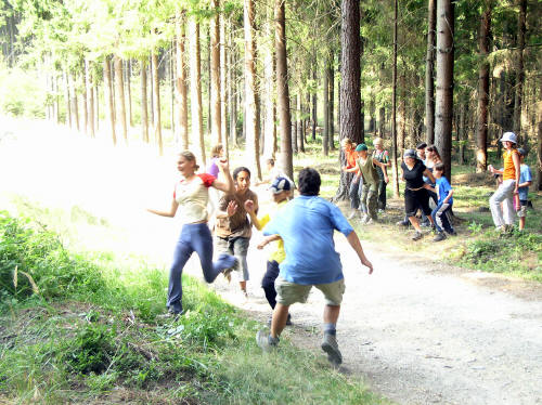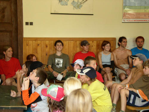 Při dopolední hře bylo naším úkolem přenést přes střeženou hranici na papírkách jednotlivá slova a z nich pak v táboře sestavit vtipný text.