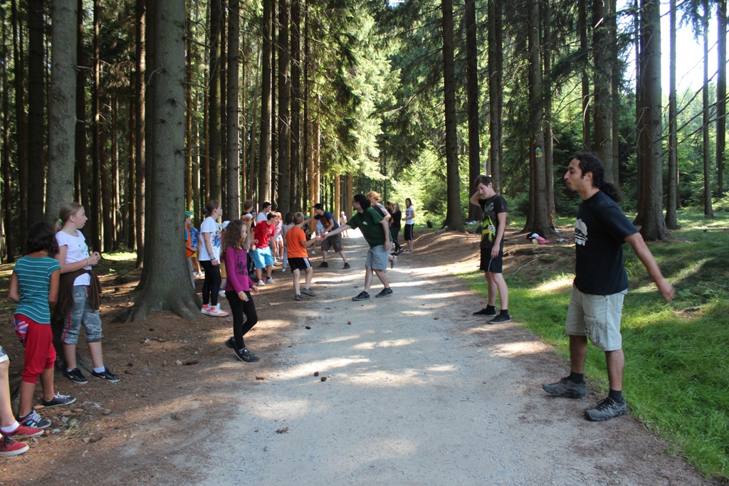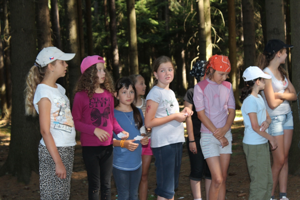 Jako dopolední hru jsme hráli hranice, kde vedoucí stojí na cestě, děti ji musí přejit na druhou stranu a donést lísteček s jejich jménem, aniž by se jich vedoucí dotkli. Ačkoli se stalo pár malých úrazů, všichni to ve zdraví přežili. Pak jsme se odebrali do tábora na oběd, protože všichni už měli obrovský hlad. Naše milé kuchařky nám uvařily výborný vývar s nudličkami, kuře s rýží a dokonce i s mrkvovým salátem.