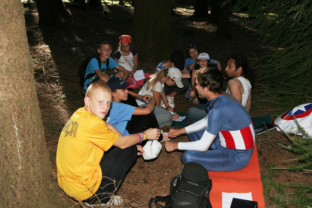Když jsme se vrátili do tábora, divili jsme se, jak je všude čisto. Vedoucí totiž nezaháleli a započali úklid a přípravu na střídání turnusů. Už se blíží konec... Ach jo! :-( Poté co jsme si po hře trochu odpočinuli, hned nás svolávali na oběd. Všichni utíkali do jídelny a netrpělivě čekali, až nás vedoucí dne zavolá k vydávání jídla. K obědu totiž byly řízky s bramborovou kaší, na které se celý tábor velmi těšil. Našim plným bříškům jsme museli ulevit o poledním klidu. Když Kuba otevřel okna diskotékárny a pustil nástupovou písničku, věděli jsme, že nás čeká závěrečná etapovka. Na nástupu se odehrála scénka superhrdinů a dozvěděli jsme se, že budeme hrát naší nejoblíbenější hru „empétrojku“.