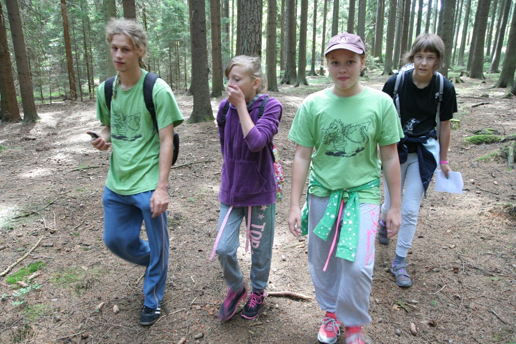 Ráno po probuzení hudbou z Jamese Bonda a krátké ranní rozcvičce, na nás čekali v jídelně naše oblíbené cereálie s mlékem a teplý čaj. Dnešní den jsme strávili téměř celý mimo tábor. Ondra si pro nás připravil empétrojku po hodně širokém okolí. Prošli jsme snad všechny lesy a louky okolo Kamenice, Dubí, Rozkoše, Plačkova...