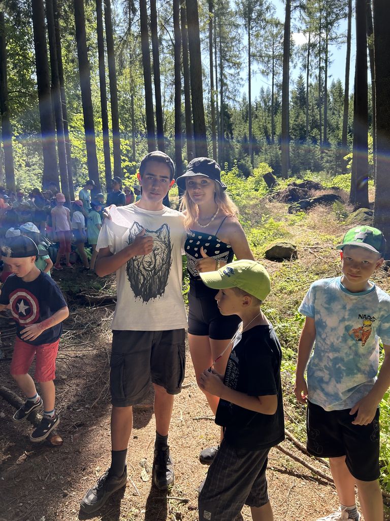 Po snídani jsme se sešli na nástupu a vydali se do lesa zahrát si hru na schovku. Vedoucí se rozprostřeli po lese a čekali až je děti najdou. Všichni jsme si hru moc užili, smáli jsme se a těšili jsme se na oběd s očekáváním, co nám v kuchyni připraví. Po vzrušující hře jsme se vrátili zpět do tábora, kde nás čekal vysněný oběd. Pochutnali na chutném kuřecím vývaru a pečeném kuřeti s rýží.