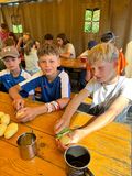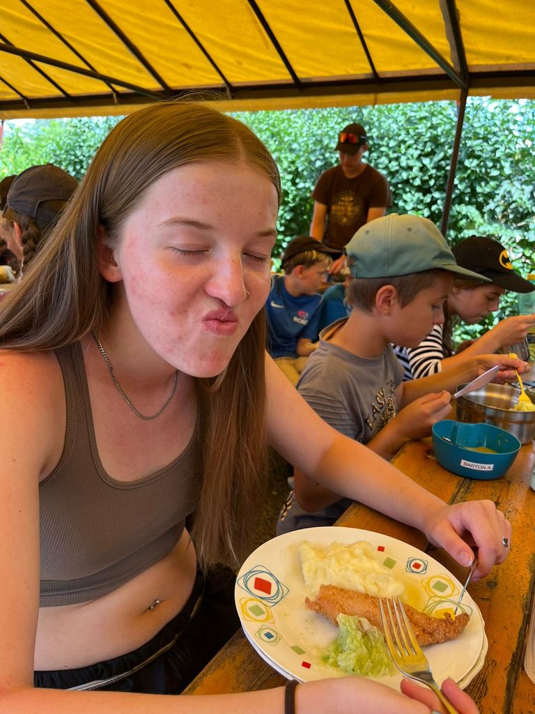 Před šestou hodinou večerní jsme se vrátili do tábora, odložili si věci a šli se připravit na večeři. K té jsme měli knedlíčky plněné meruňkami se skořicí a kakaem. Protože jsme se jimi přepapali, jak dobré byly, potřebovali jsme chvíli klidu před večerním nástupem. Na tom jsme si vyslechli oddílové pokřiky a dozvěděli se výsledky obou dnešních her.
