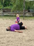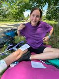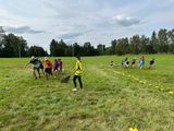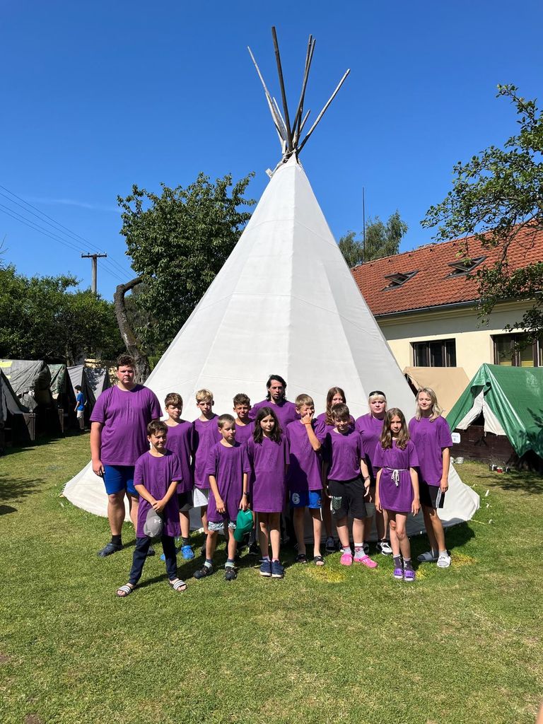 Po hře jsme se vrátili na základnu, umyli si ručičky a šli na oběd. K obědu nám naši šikovní kuchaříčci připravili výborné krůtí řízky s bramborovou kaší a okurkovým salátem. Na konci posledního klidu jsme se sešli na nástupu, kde nám vedoucí rozdali krásná táborová trička a my se v nich rovnou po oddílech vyfotili. I odpolední hra se dnes odehrávala na louce, protože jsme hráli Formule. Vždy proti sobě soutěží dva oddíly, kteří mají na svých formulích vedoucího a snaží se ho po okruhu dovézt rychleji než oddíl druhý.
