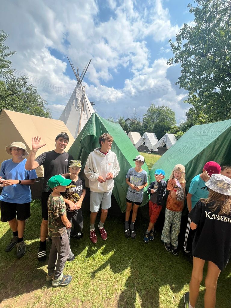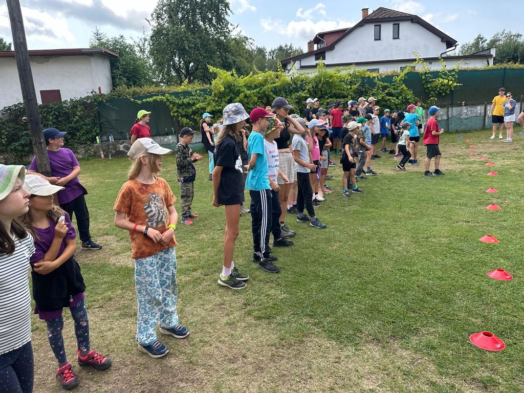 Vzhledem k tomu, že dopoledne bylo ve znamení deště a nepříjemného počasí, tak jsme místo hry v lese trávili čas pod střechou v diskotékárně a po oddílech hráli hru jménem Milionář. Pokládají se otázky týkající se tábora nebo vedoucích a v oddílech se střídají děti a postupně odpovídají se snahou odpovědět na otázku správně, protože za správné odpovědi získává oddíl body. Jelikož nezabrala hra tolik času, do oběda jsme potřebovali ještě děti zabavit a počasí už nám naštěstí hrálo do karet, tak jsme šli ven a v táboře na hřišti si zahráli hru Hranice. Je vyznačená hranice, na které stojí vedoucí, a děti musí přes hranici přejít bez doteku od vedoucího, aby vhodily lísteček se svým jménem do kotlíku na druhé straně.