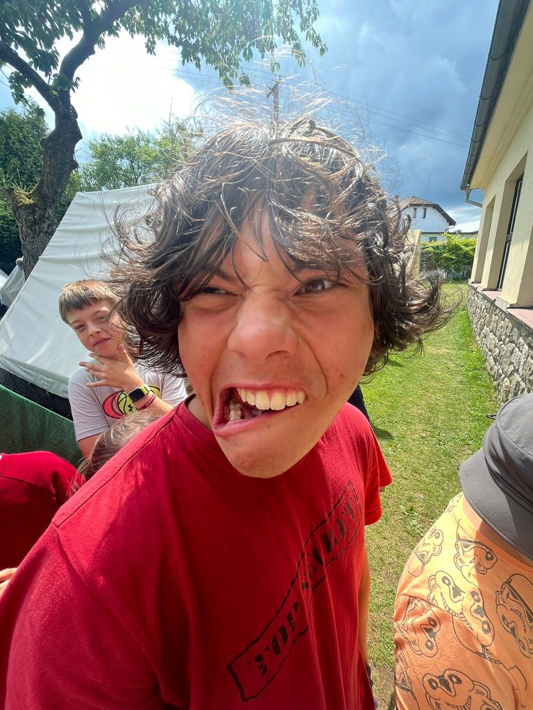 Po návratu jsme si umyli ručičky a s hrníčky se rozešli do jídelny, kde na nás čekal chleba s výbornou makrelovou pomazánkou, ta se Bizonkovi s Adélkou moc povedla. Až nezbyla u stolů ani noha, zazněla nám znělka na nástup a my se sešli na hřišti. Klasicky jsme si rozdali ztracené a nalezené věci, řekli si pokyny na další den, rozdali tresty a poslechli pokřiky všech oddílů. Po nástupu už nás čekala večerní zábava, mohli jsme si hrát, kopat míčem, číst nebo navštívit bobříky a kroužky. V deset hodin začala pro většinu tábora večerka, výjimkou ovšem byly naše starší děti, na které čekaly výsadky. Po malých skupinách se posadily s doprovodem vedoucího do aut, zavázaly si oči a jednotlivá auta odjela na různá místa vždy pár kilometrů od vesnice. Cílem každé skupinky pak bylo se bez použití mapy co nejefektivněji vrátit do tábora. Po návratu na děti čekala druhá večeře a pak už šly také do hajan.