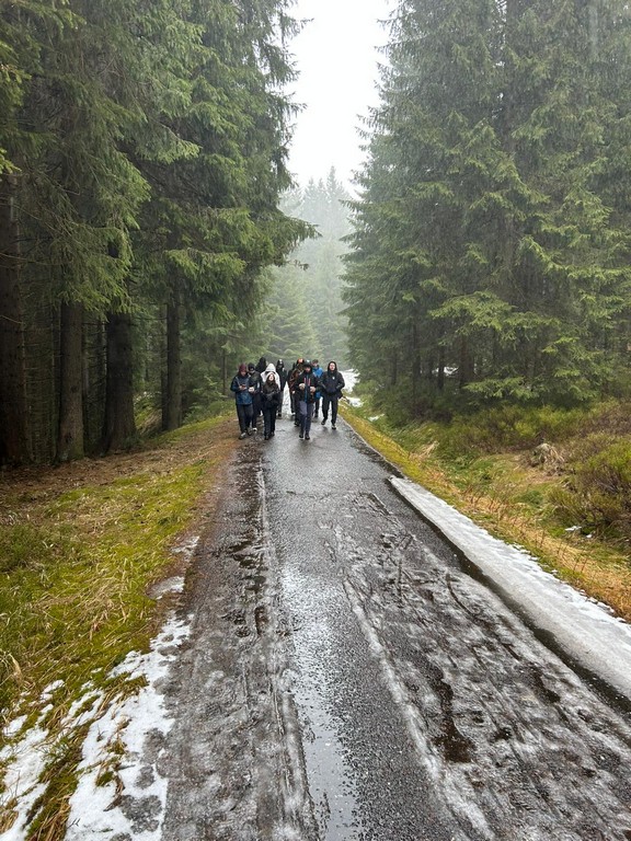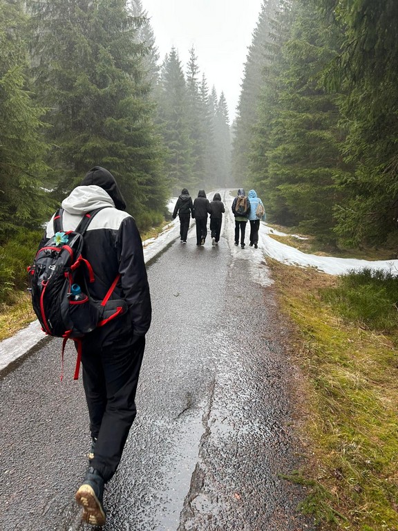 Za doprovodu stálého deště se po čase před námi objevila chata a s ní i teplo uvnitř. Hrnek čaje na zahřátí nám prospěl stejně jako teplá sprcha. Dali jsme si usušit mokré věci na sušák a šli si sníst řízek k obědu – typickou českou lahůdku na výlety, ale ten náš bohužel dneska nevyšel. Namísto toho se pustil film ve společenské místnosti jako tzv. mokrý program. Zvuk chroupání brambůrků či popcornu naznačoval spokojenost při bedlivém sledování děje, který byl napínavý až do samotného konce.