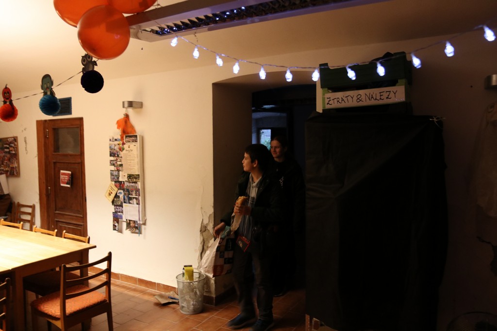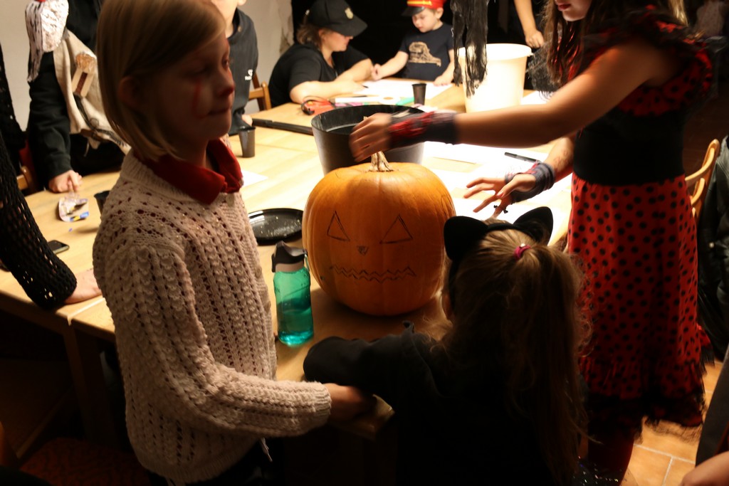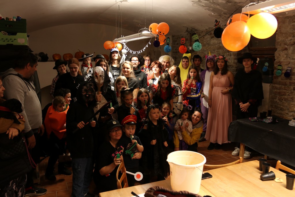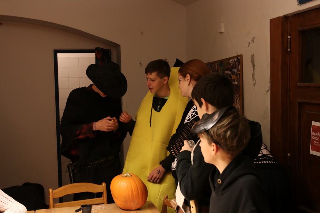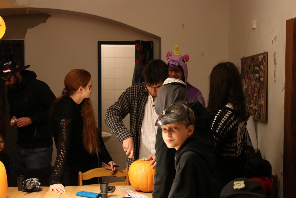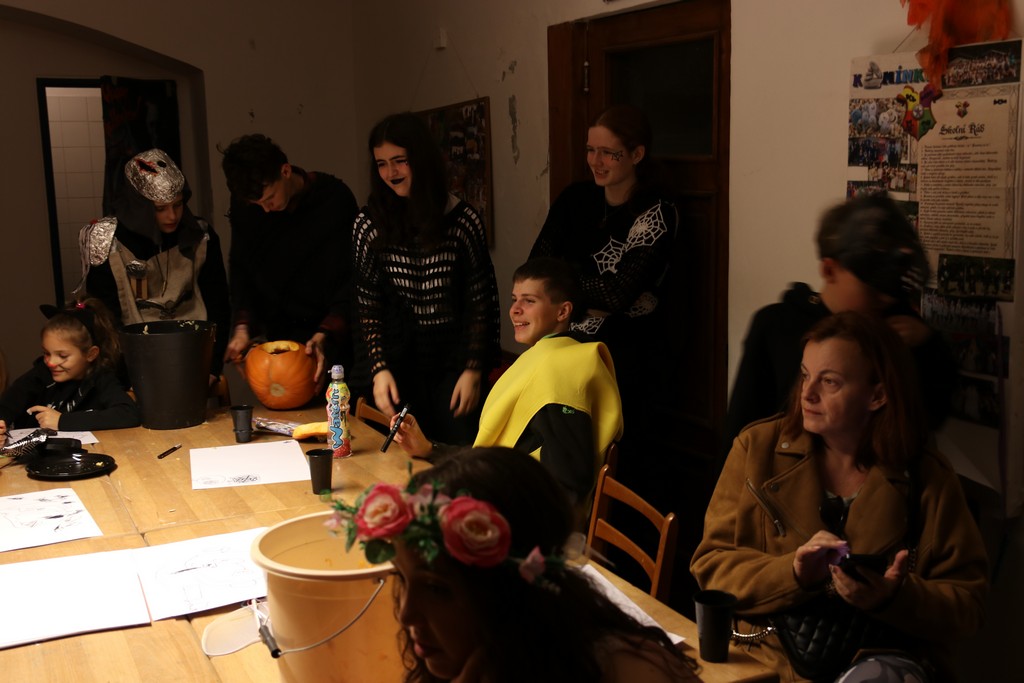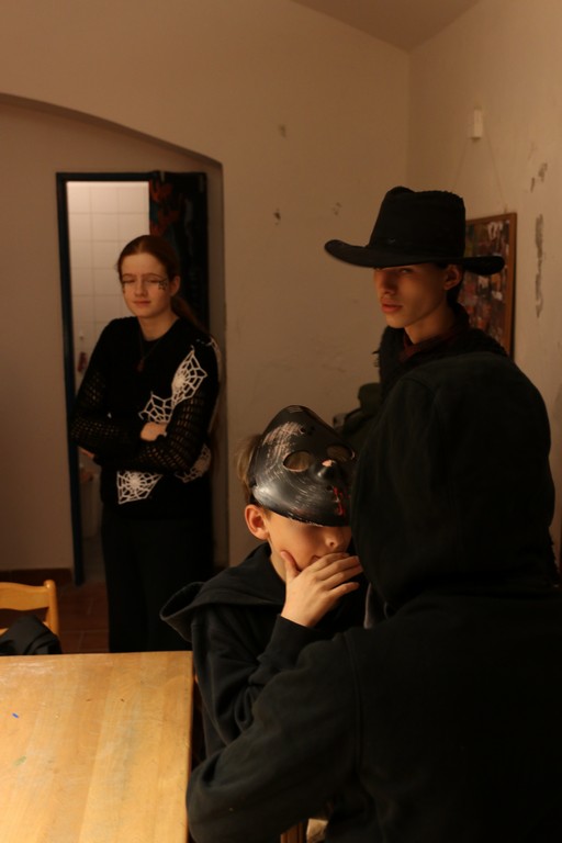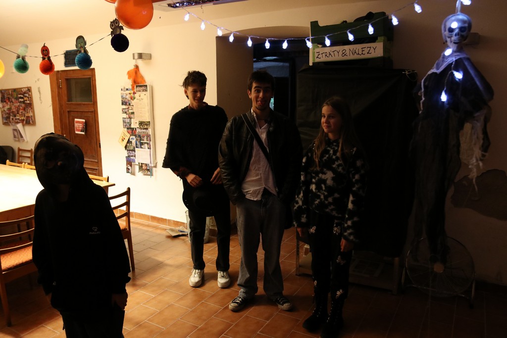 Je čtvrtá hodina odpolední posledního listopadového dne, a to znamená kamenický Halloween! Naše klubovna, která se proměnila v dům hrůzy, se plní různými strašidly a pohádkovými bytostmi. Samozřejmě není kam spěchat – za lehkého zvuku hudby je nejprve potřeba se připravit na přicházející program. K tomu napomáhá nepřeberné množství sladkostí a jídla i jakási červená kapalina, ve které plave cosi připomínající oční bulvy – budeme jen doufat, že svou zcela nápadnou podobnost pouze připomínají.
